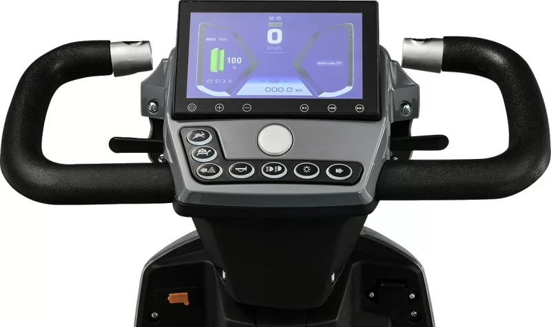 Het moderne LCD-instrumentenpaneelpresenteert snelheid, accuniveau en afgelegde afstand in één oogopslag. Grote, hoog-contrast cijfers zorgen voor probleemloze aflezing onder fel zonlicht én in schemer. De bedieningselementen rond het stuur zijn logisch gegroepeerd en vragen minimale knijpkracht. Zelfs met verminderde handfunctie blijft de scooter hierdoor eenvoudig onder controle.