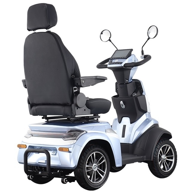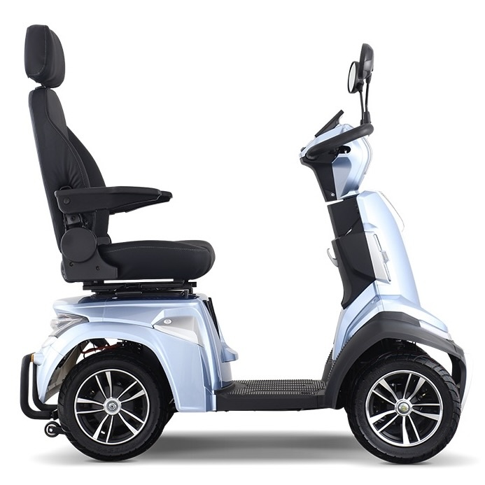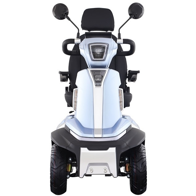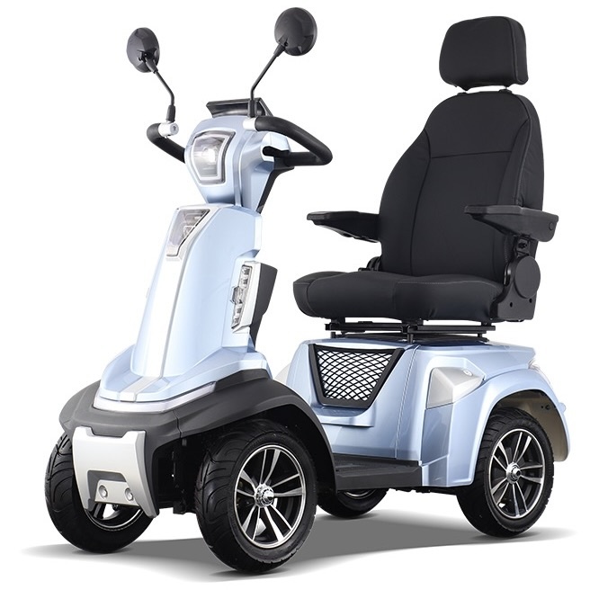 De E-MOTO T4is ontwikkeld voor mensen die in alle vrijheid willen blijven bewegen zonder in te leveren op comfort of veiligheid. Zijn lichtblauwe carrosserie springt direct in het oog, maar onder die frisse kleur schuilt een uitgekiende mix van technologie en ergonomie. Het stabiele vierwiel-onderstelgeeft extra zekerheid op ongelijke paden, terwijl de compacte bouw de scooter verrassend wendbaar houdt in winkelgangen en smalle trottoirs.