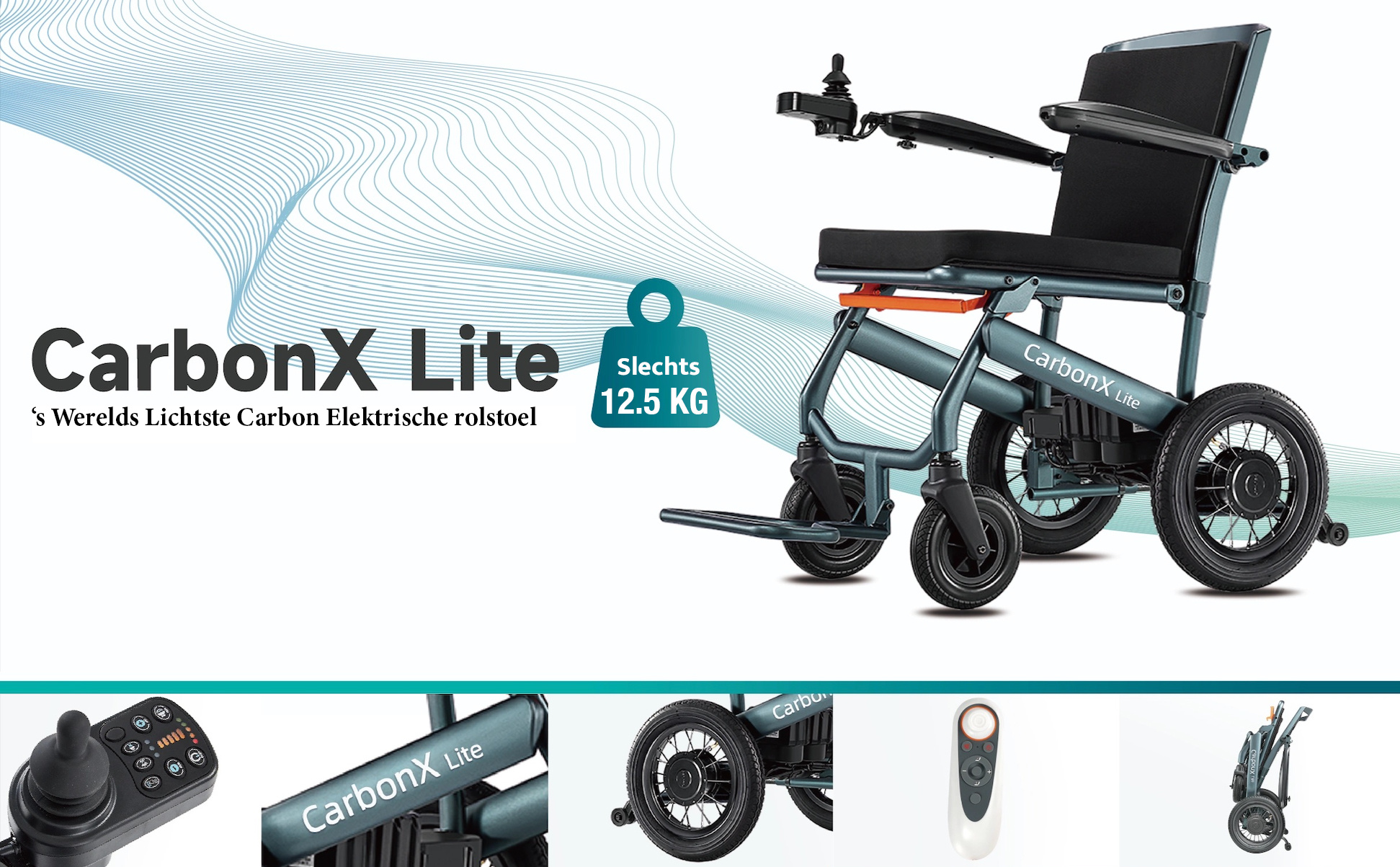 - Ultralicht Ontwerp: Met een totaalgewicht van slechts 12.5 kg is de CarbonX Lite de lichtste elektrische rolstoel op de markt. Perfect voor eenvoudig transport en opslag.