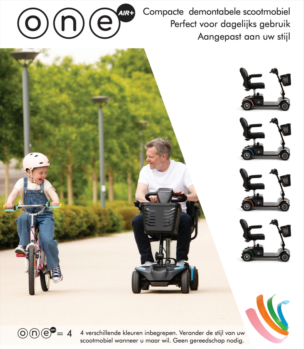 Met een kleine draaicirkel is de One Air+ perfect voor dagelijkse uitstapjes naar de supermarkt, een restaurant, of voor het navigeren in kleine ruimtes. Deze scootmobiel is volledig demontabel, waardoor opbergen of reizen nog nooit zo eenvoudig is geweest. Andere kenmerken zijn een draaibare stoel, een batterijdisplay en opklapbare armleuningen.