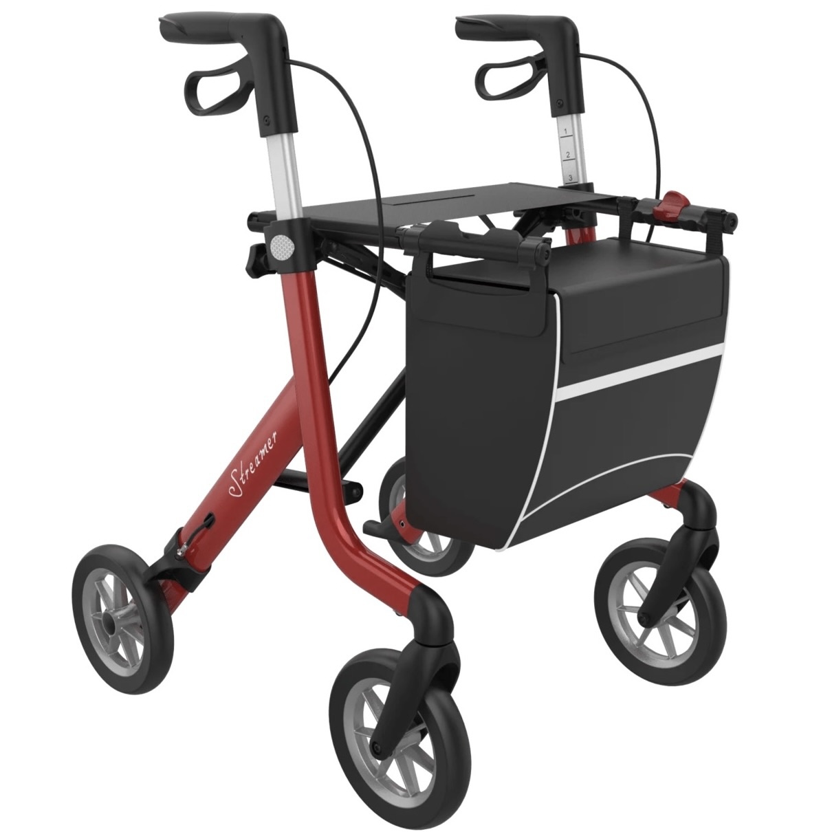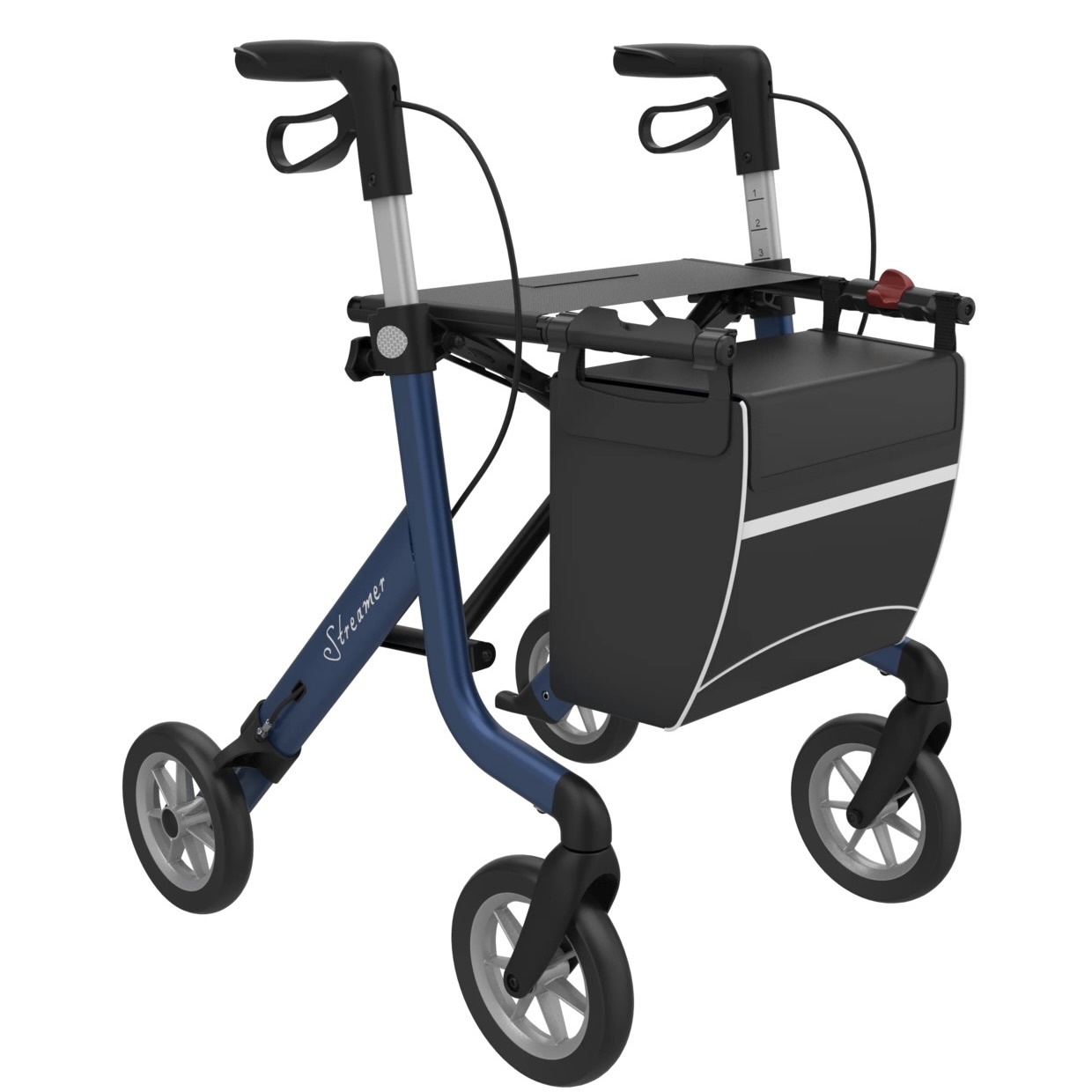 - Heel makkelijk in te klappen door de zitting omhoog te halen. Dit in combinatie met het zeer lichte gewicht van de rollator is de Streamer ideaal om te vervoeren met bijvoorbeeld de auto.