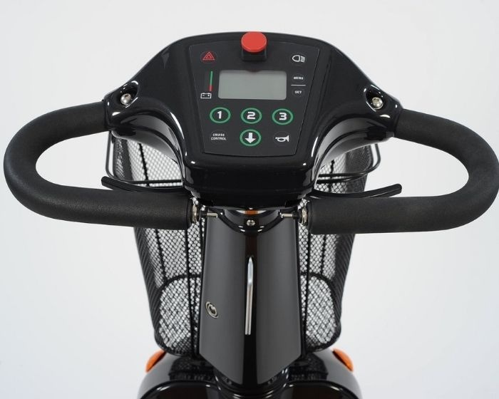 Het intuïtieve stuurpaneel van de Solo 4 scootmobiel toont alle essentiële informatie zoals snelheid, afgelegde afstand, tijd, datum en buitentemperatuur. De gasveer maakt het eenvoudig om altijd de perfecte stuurpositie in te stellen.
