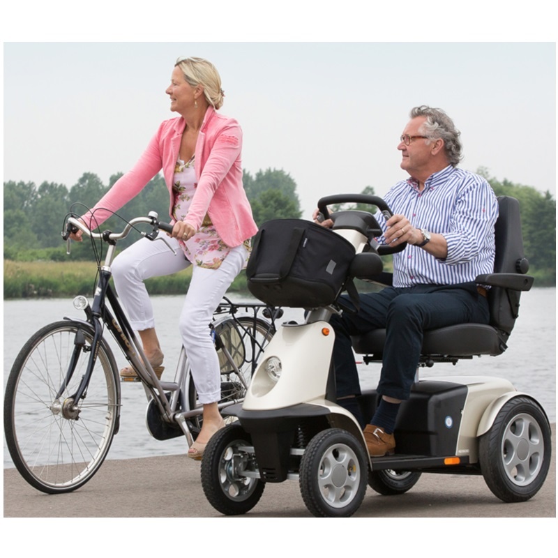 Het veersysteem is onafhankelijk per wiel afgesteld, wat schokken dempt en het chassis stabiel houdt, zelfs op hobbelige ondergrond. De ergonomisch gevormde, volledig verstelbare kapiteinsstoel biedt een royale zitting (46 × 44 cm) met 360°-draaifunctie en comfortabele armleggers; zo stapt u eenvoudig in en uit en vindt u altijd een ontspannen rijpositie—zelfs bij gevoelige rug of gewrichten.