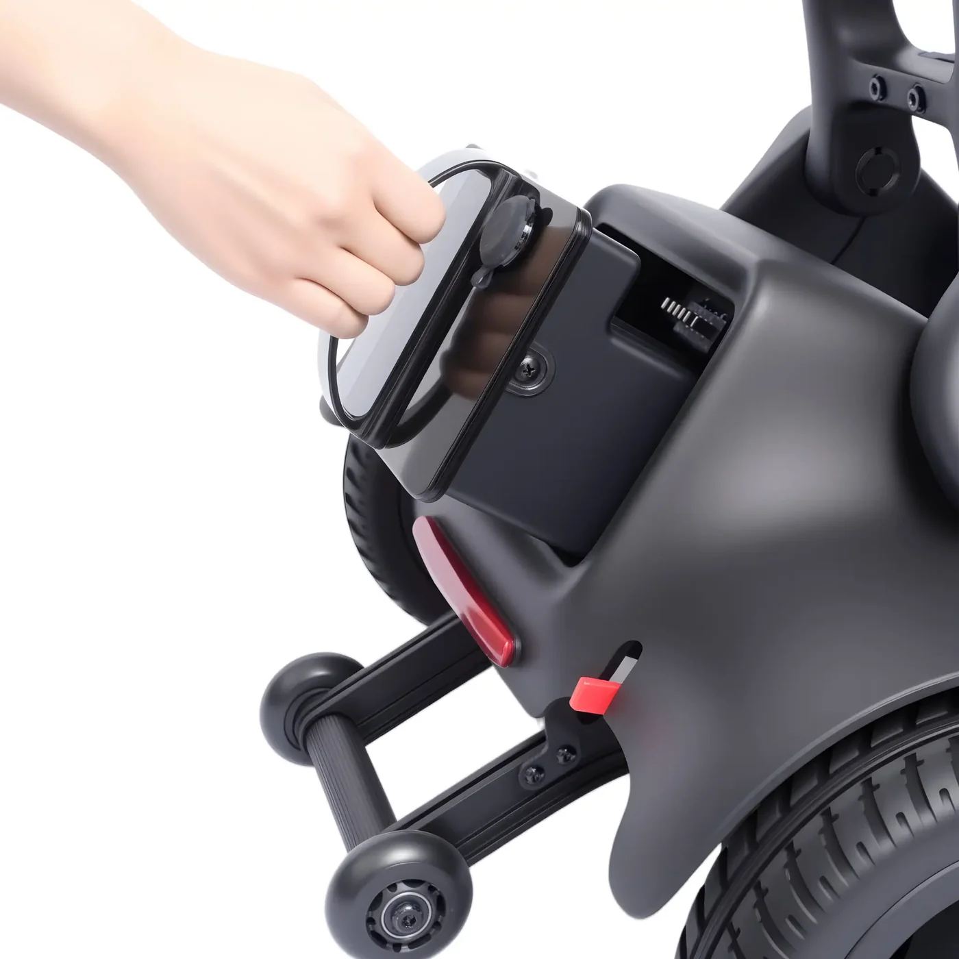 De rolstoel is uitgerust met anti-kantelwielen, slimme elektromagnetische remmen en een stabiel onderstel.