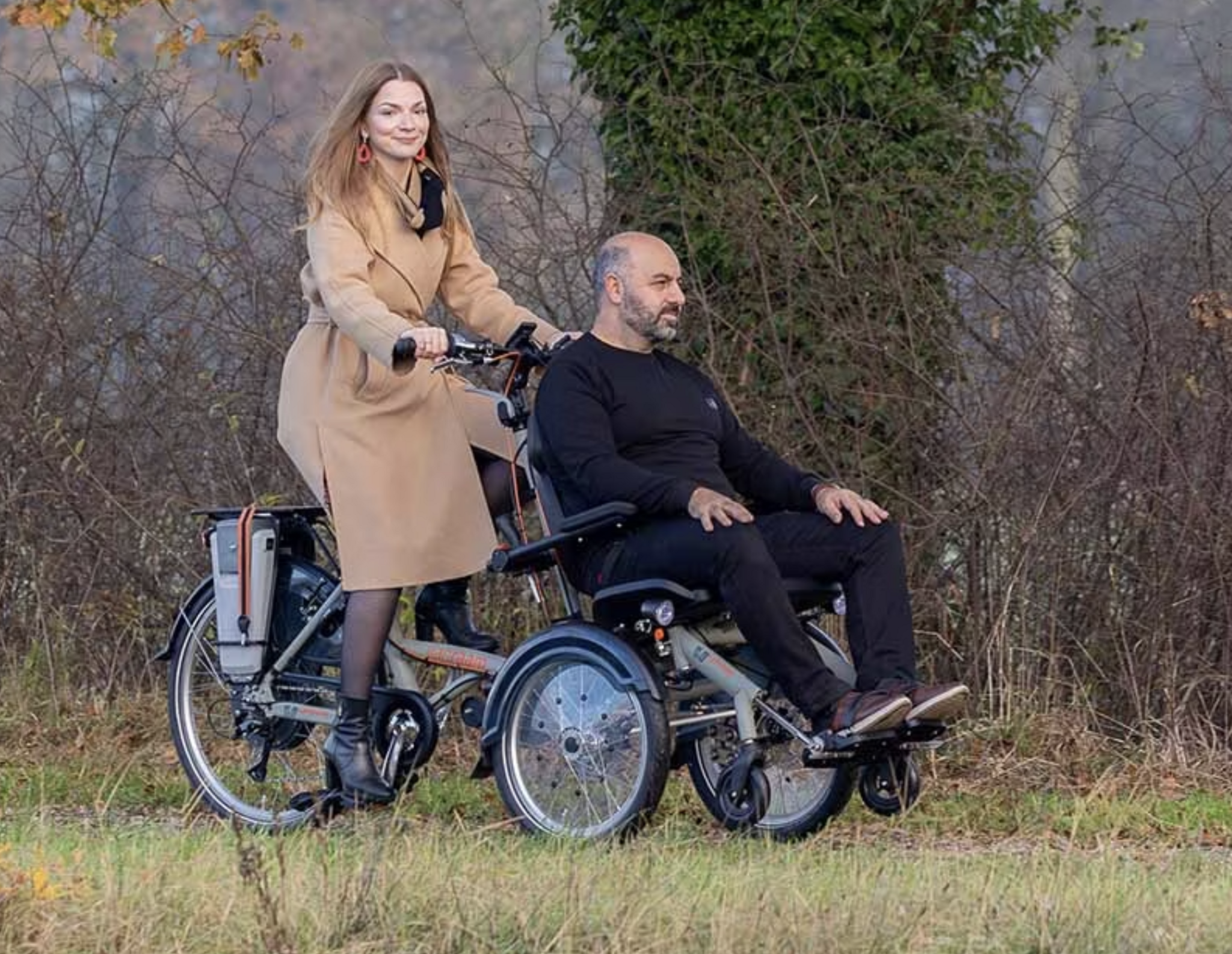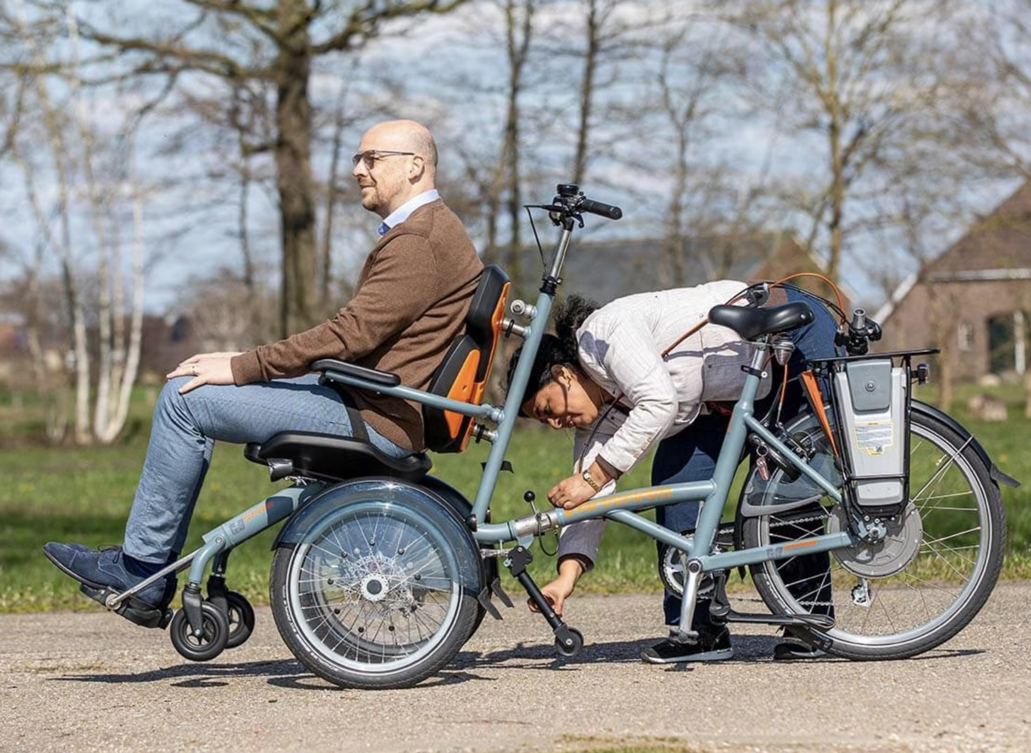 De Van Raam OPair is een moderne elektrische rolstoelfiets die comfort, veiligheid en gebruiksgemak perfect combineert. Bij dit model zit de passagier voorop in een ergonomische stoel met goede ondersteuning, terwijl de bestuurder achter stuurt en trapt. Dankzij de stabiele driewielconstructie en lage instap is de OPair veilig en eenvoudig in gebruik.